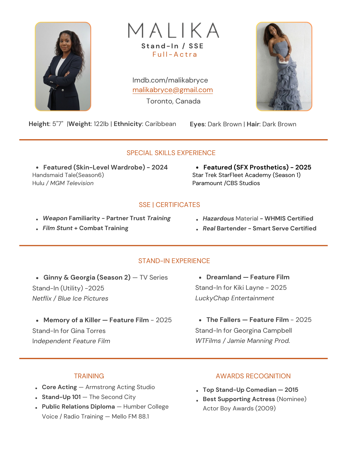With extensive stand-in experience for high-profile talent (Gina Torres, Georgina Campbell ) and specialized SSE tactical training, Malika is the go-to for urban female roles and military/police positions in Toronto.